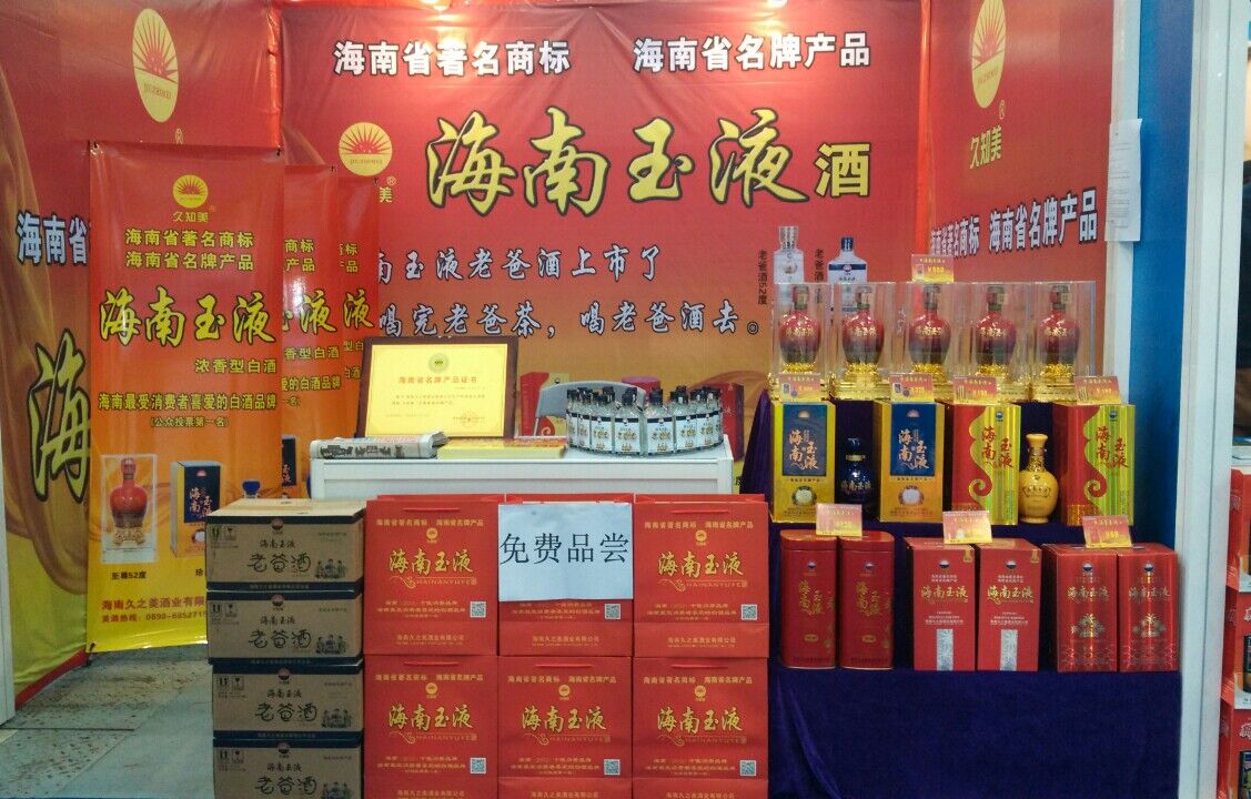 海南久之美酒業(yè)有限公司應(yīng)邀參展。海南玉液酒是海南久之美酒業(yè)有限公司為海南本土市場(chǎng)量身定制的優(yōu)質(zhì)濃香型白酒,飲后或豪飲后均不上頭、不口干、身體恢復(fù)快。2012年被海南省工商局認(rèn)定為“海南省著名商標(biāo)”;2013年被海南省名牌產(chǎn)品認(rèn)定委員會(huì)授予為“2013年海南省名牌產(chǎn)品”稱號(hào)。該酒經(jīng)多位國(guó)家級(jí)和省級(jí)評(píng)酒專家品評(píng),一致認(rèn)同海南玉液酒不亞于“五糧液” 。