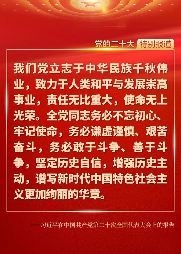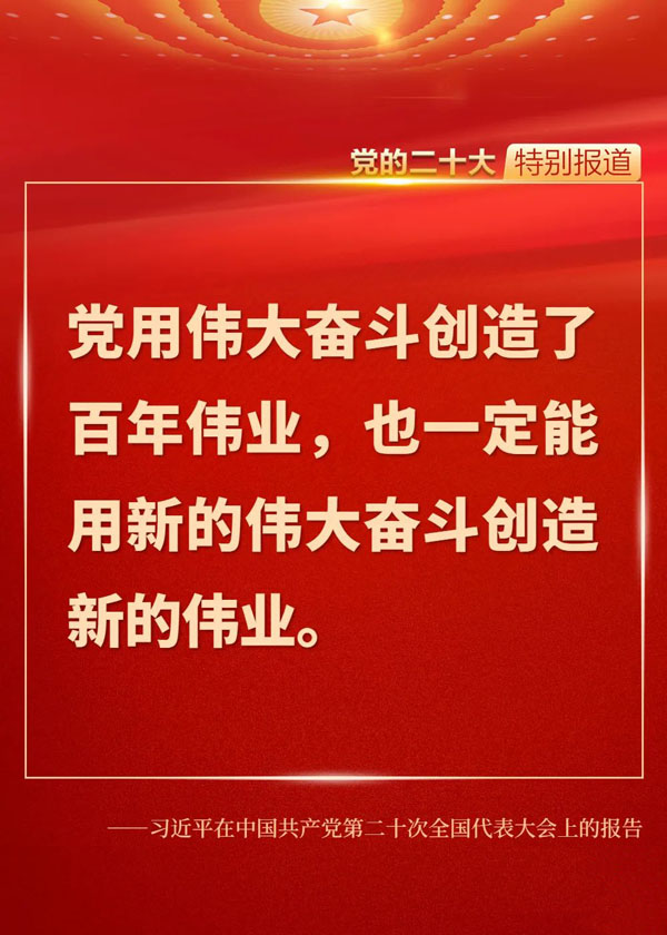 在全黨全國各族人民邁上全面建設(shè)社會主義現(xiàn)代化國家新征程、向第二個百年奮斗目標(biāo)進(jìn)軍的關(guān)鍵時刻,黨的二十大科學(xué)謀劃未來5年乃至更長時期黨和國家事業(yè)發(fā)展的目標(biāo)任務(wù)和大政方針,為新時代的我們立起了新的歷史坐標(biāo),指明了新的奮斗方向,催人奮進(jìn)、鼓舞人心。一起來重溫報告中的金句!