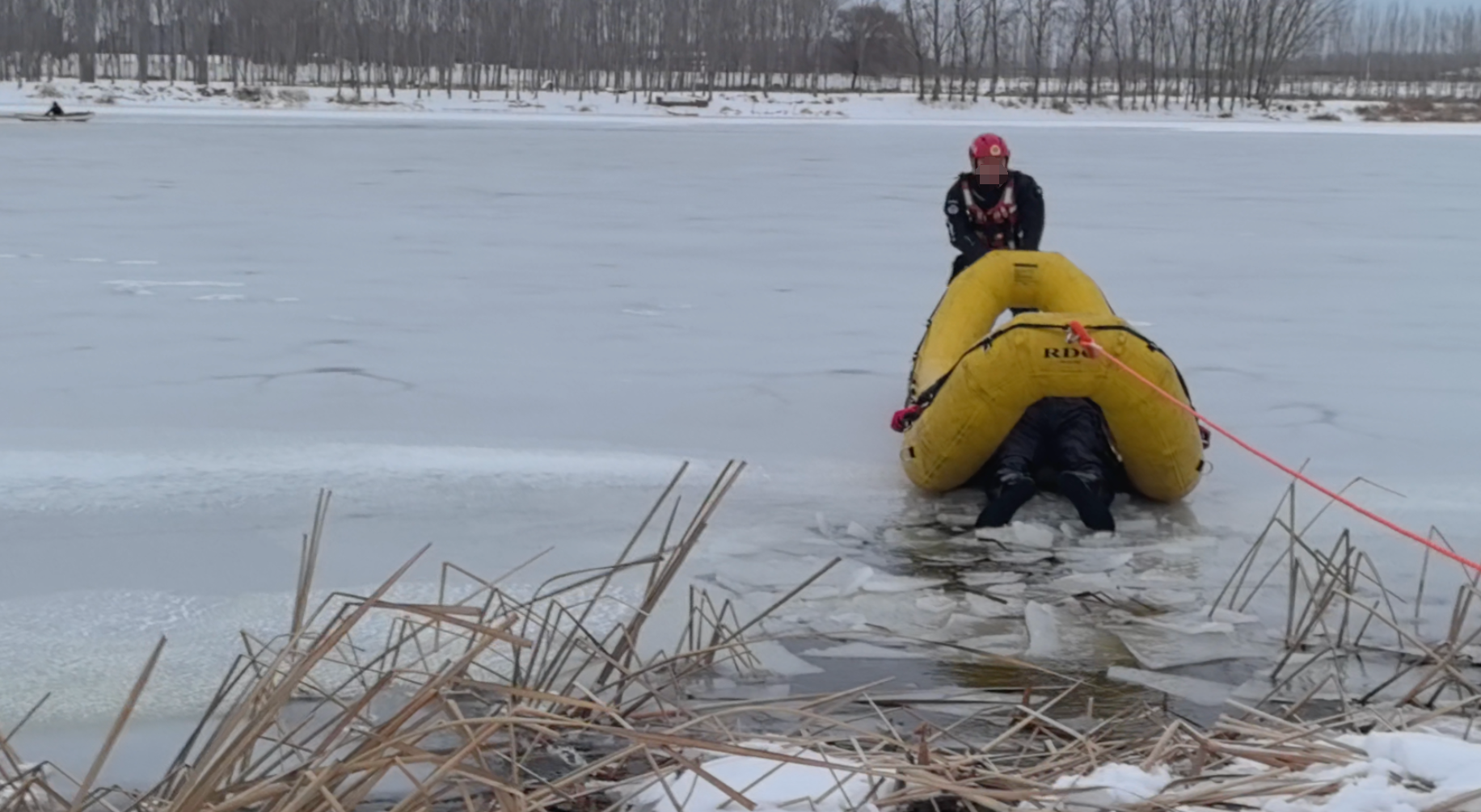 剛下河,冰面就破裂了,兩名消防員顧不上寒冷,從河水中爬出,毅然踏冰,抬著救生筏一步步朝著河中央進(jìn)發(fā)。其間,兩人數(shù)度遭遇冰裂,他們便調(diào)整姿勢(shì)并利用船槳破冰劃行。岸上的消防員則一點(diǎn)點(diǎn)地釋放手中的繩索,緊緊關(guān)注著兩名隊(duì)友的狀態(tài)。