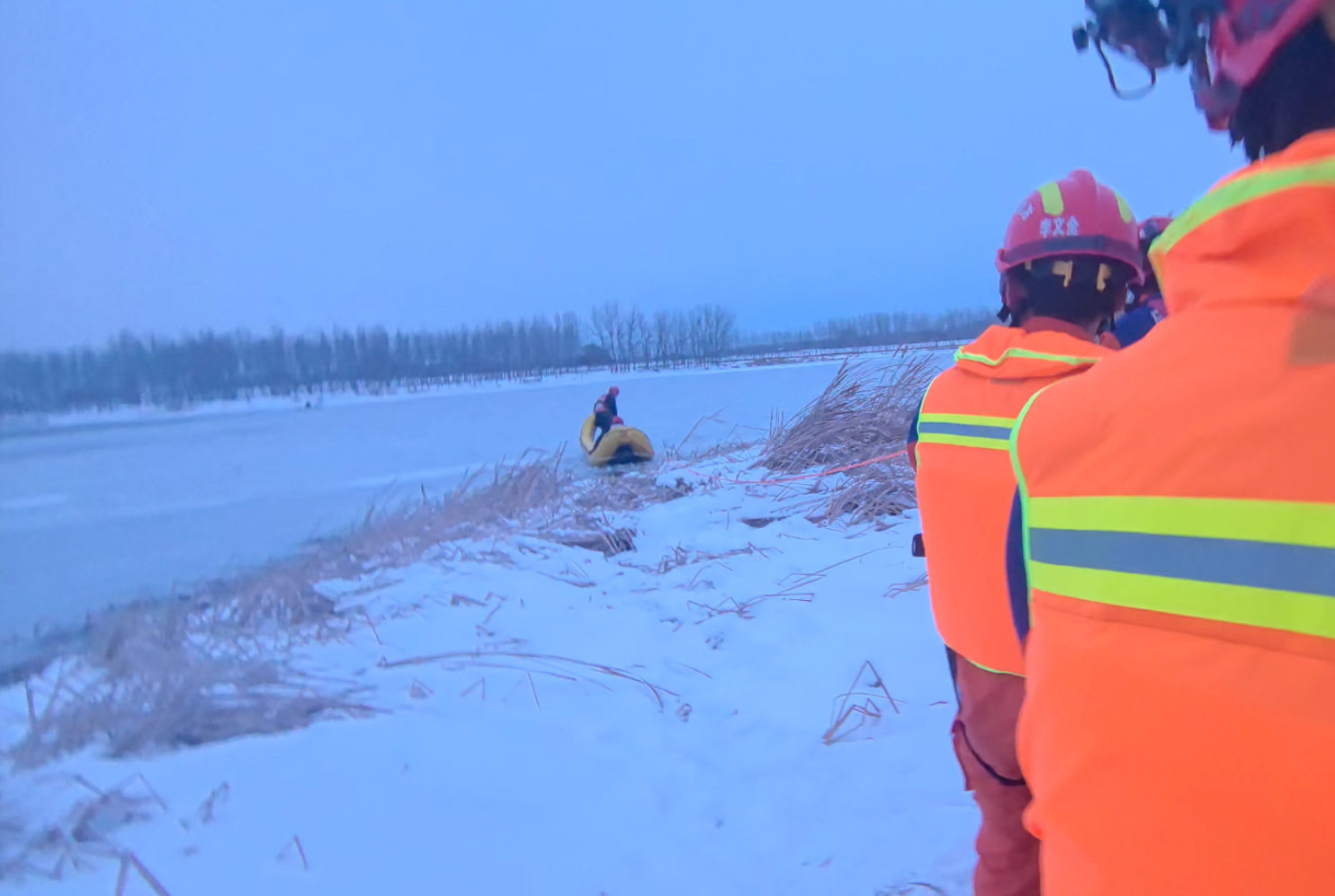 消防救援人員率先到場(chǎng)后發(fā)現(xiàn),事發(fā)河段位于北京與河北交界處,河面寬闊約160多米,靠近北京的一側(cè)有大片冰面,靠近河北的一側(cè)有少許水面,而報(bào)警男子正困于冰、水交界的地方。